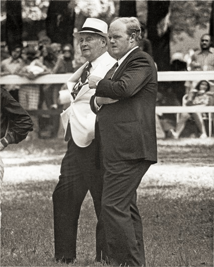 Above photo: Ogden Phipps and his son Ogden Mills “Dinny” Phipps at Saratoga in 1973. (BloodHorse Library)