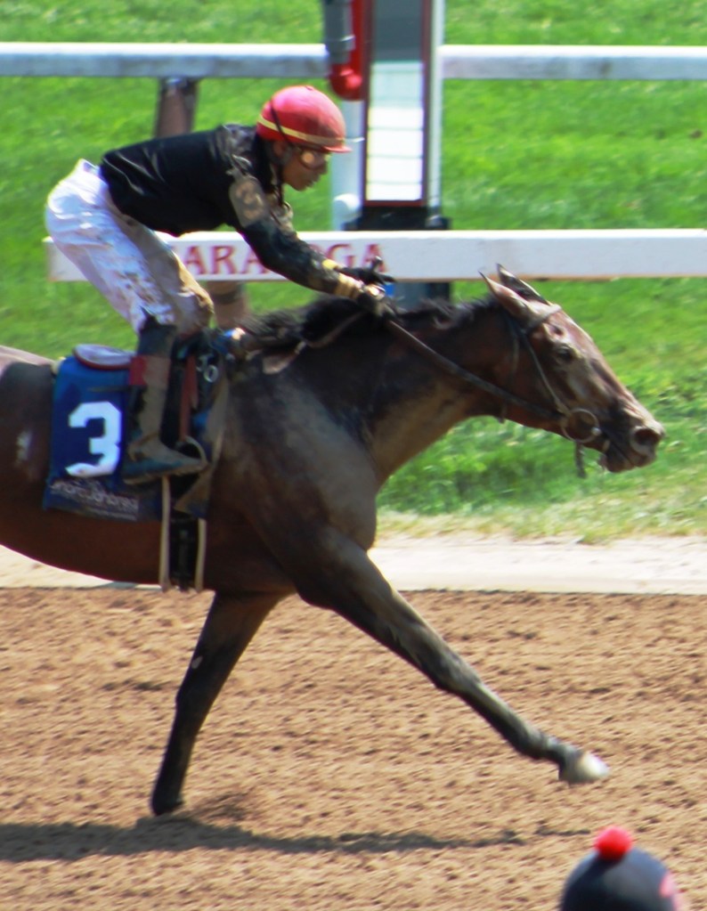 Above: Dance Club crossing the finish line in her career debut at Saratoga.